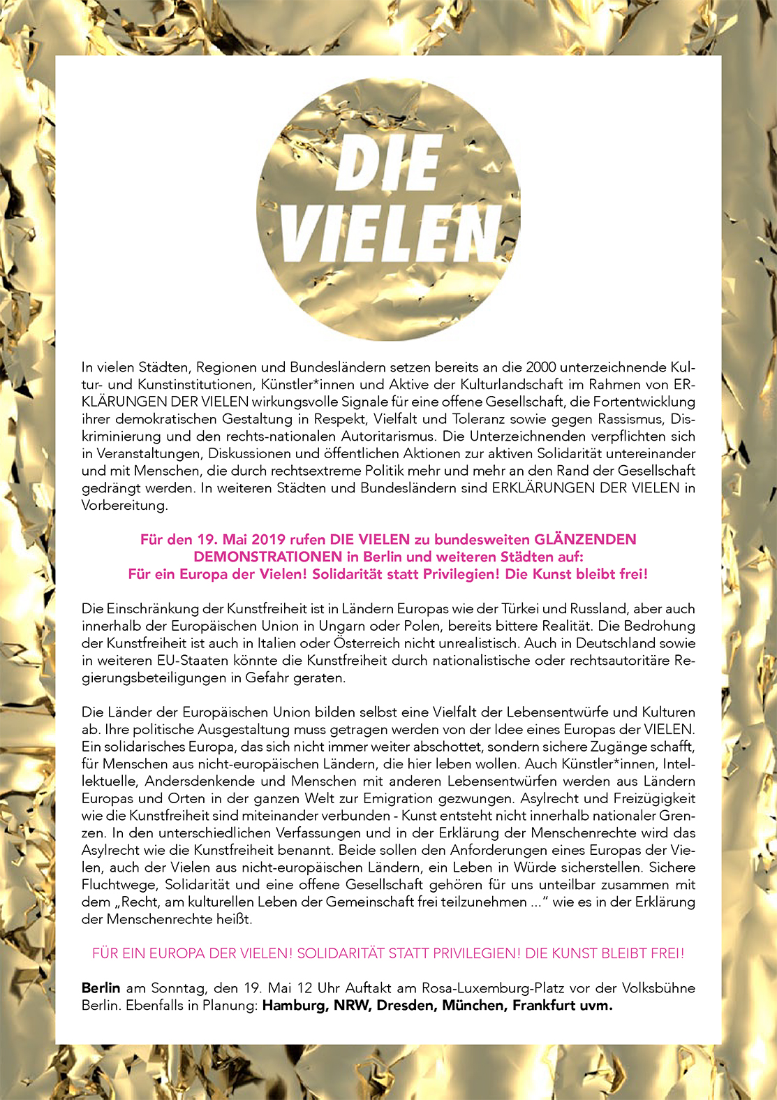Als Kulturschaffende in Deutschland stehen wir nicht über den Dingen, sondern auf einem Boden, von dem aus eines der größten Staatsverbrechen der Menschheitsgeschichte begangen wurden. Kunst wurde als „entartet“ diffamiert und Kultur flächendeckend zu Propagandazwecken missbraucht. Millionen Menschen wurden ermordet oder gingen ins Exil, unter ihnen auch viele Kunstschaffende. Heute begreifen wir die Kunst und ihre Einrichtungen, die Museen, Theater, Ateliers, Clubs, die urbanen und ländlichen Orte der Kultur als offene Räume, die Vielen gehören. Unsere Gesellschaft ist eine plurale Versammlung. Viele unterschiedliche Interessen treffen aufeinander und finden sich oft im Dazwischen. In einer Demokratie muss täglich neu verhandelt werden – aber immer unter einer Voraussetzung: Es geht um Alle, um jede*n Einzelne*n! Der Boden, auf dem wir gemeinsam stehen, ist das Grundgesetz. Der rechte Populismus, der die Kultureinrichtungen als Akteure dieser gesellschaftlichen Vision angreift, steht der Kunst der Vielen feindselig gegenüber. Rechtspopulistische Gruppierungen und Parteien stören Veranstaltungen, wollen in Spielpläne und ins Programm eingreifen, polemisieren gegen die Freiheit der Kunst und arbeiten an einer Renationalisierung der Kultur. Ihr verächtlicher Umgang mit Menschen auf der Flucht, mit engagierten Kulturschaffenden, mit Andersdenkenden verrät, wie sie mit der Gesellschaft umzugehen gedenken, sobald sich die Machtverhältnisse zu ihren Gunsten verändern würden. In unserem Bundesland Sachsen-Anhalt arbeiten zahlreiche rechtsradikale und rechtsextreme Kräfte Hand in Hand und versuchen mit Macht, unsere demokratische weltoffene Gesellschaft abzuschaffen. Dem stellen wir uns entgegen. Wir als Unterzeichnende der halleschen Theater, Kunst- und Kultureinrichtungen und ihrer Interessensverbände begegnen diesen Versuchen mit einer klaren Haltung.
